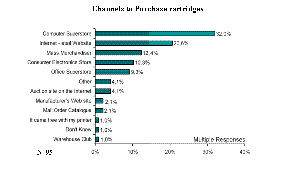 調(diào)查機(jī)構(gòu)發(fā)現(xiàn):用戶購買照片墨水和介質(zhì)的渠道有較大區(qū)別,雖然電腦超市都是用戶最常去的場所,但墨水的銷售很多是通過Internet和大型超市實(shí)現(xiàn)的,而介質(zhì)通過Internet網(wǎng)的銷售方式僅排第5位,大量用戶選擇在大型超市、辦公品商場購買。用戶選擇在辦公品商場購買墨水的比例僅占9.3%。上述區(qū)別的原因可能是:用戶對墨水品質(zhì)保證的關(guān)注程度高于介質(zhì),顯而易見相比于介質(zhì),墨水對打印機(jī)可能能造成更大的傷害。