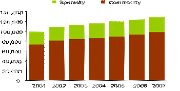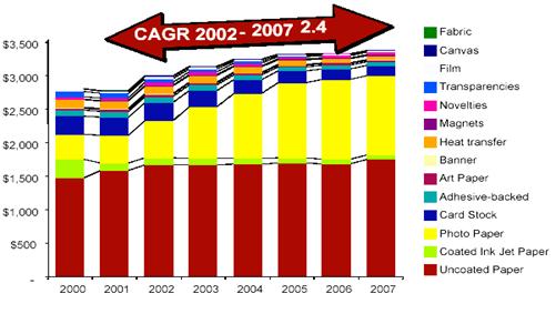 統(tǒng)計(jì)數(shù)據(jù)表明,美國家用電腦和打印機(jī)的普及培育了桌面噴墨打印的市場,2004年噴墨方式輸出的1160億張打印紙中,特殊打印介質(zhì)將近300億張,預(yù)期2002年至2007年間普通噴墨打印紙和特殊打印介質(zhì)均會有穩(wěn)定增長,這段時(shí)間內(nèi),噴墨打印介質(zhì)的打印數(shù)量年度遞增率(CAGR)為3.5%。2004年美國整個(gè)噴墨介質(zhì)的收入超過32億美元,其中普通產(chǎn)品約17億美元,透明片或其它膠片薄膜產(chǎn)品0.5219億美元,特殊打印介質(zhì)超過13億美元。雖然普通產(chǎn)品(commodity)仍是噴墨打印的主要輸出對象,數(shù)量上占了總噸數(shù)的75%,但由于價(jià)格低,其銷售額只占總銷售額的40%。 2005年預(yù)期桌面噴墨打印的總量將超過1202億張,市場份額33億美元。2002-2007年間預(yù)期噴墨打印紙的銷售額年遞增率2.4%。特殊打印介質(zhì)包括彩噴紙(Coated paper),照片打印紙(Photo paper),明信片紙,背膠,油畫紙,標(biāo)簽紙等等。在特殊打印介質(zhì)的增長中,彩噴紙的增長速度相比較慢,而照片打印紙?jiān)鲩L速度很快,預(yù)計(jì)2002-2007年間照片打印紙的年遞增率將高達(dá)16%!這種增長歸功于低價(jià)位數(shù)碼相機(jī)的熱銷;低于50美元打印機(jī)的銷售;和數(shù)字圖像傳輸?shù)目旖菪浴?/span>