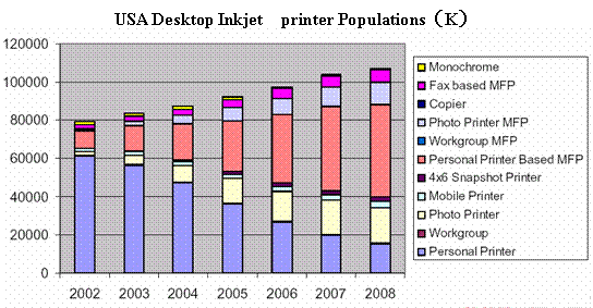 2004年11月15日InfoTrends研究機(jī)構(gòu)發(fā)表的市場調(diào)查結(jié)果表明,2003年美國共安裝了超過8300萬臺桌面噴墨打印設(shè)備,使得噴墨成為桌面打印的主要輸出方式。其中,照片噴墨打印機(jī)裝機(jī)量482萬臺,比02年增加39%。在這里所謂照片打印機(jī)(Photo Printer),是指同時(shí)具備照片級彩色輸出性能,數(shù)碼相機(jī)存儲卡插槽,照片級墨盒三種典型特征的打印機(jī)。多功能一體機(jī)(MFP, multifunctional printers or imaging devices)是將打印,掃描,傳真,復(fù)印等功能復(fù)合一體的設(shè)備,其增長的速度也非常快,2003年裝機(jī)量1585萬臺,比02年的1085萬臺增長46%。其中部分MFP除打印,掃描,傳真功能外,還具備照片彩色打印功能,這種增長同時(shí)也大大提高了特殊打印介質(zhì)(specialty media)的需求。Infotrends預(yù)期到08年,照片噴墨打印機(jī)的年裝機(jī)量可達(dá)1890萬臺,占總裝機(jī)量的18%,普通MFP高達(dá)4800萬臺,占總裝機(jī)量的45%,帶照片彩色打印功能的MFP1160萬臺,占總裝機(jī)量的11%。而普通型個(gè)人噴墨打印機(jī)(Personal Pinter)的裝機(jī)量呈逐年下降趨勢,數(shù)據(jù)表明2003年比02年下降了4.3%,普通個(gè)人噴墨打印機(jī)所占比例也逐年減少,預(yù)期08年僅占15%以下。2003-2008年間,噴墨打印機(jī)的總裝機(jī)量CAGR 為5%。