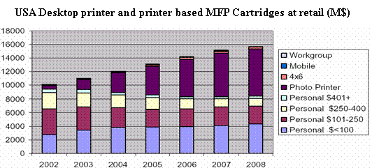 從全美零售市場的數(shù)據(jù)分析, 2003-2008年噴墨墨盒的零售總額年遞增率約8%,其中照片質(zhì)量墨盒的銷售量呈增長勢頭強(qiáng)勁。由于照片噴墨打印機(jī)和具備照片彩色打印的MFP可能使用同一型號墨盒,統(tǒng)計(jì)將兩者合并。普通噴墨MFP也和對應(yīng)的普通個(gè)人型打印機(jī)合并。數(shù)據(jù)顯示,2003年用于照片打印的墨盒零售總額19.10億美元,占全年零售總額(107.2億美元)的17.8%, 比02年的6.90億美元增加了177%。2008年, 預(yù)期用于照片打印的墨盒零售總額可達(dá)73.10億美元。對于普通的中高端墨盒零售額,由于受到價(jià)格下降和激光打印輸出方式的影響,03年到05年間有明顯下降,05年至08年基本保持不變。而低端的噴墨墨盒一直穩(wěn)中有升。