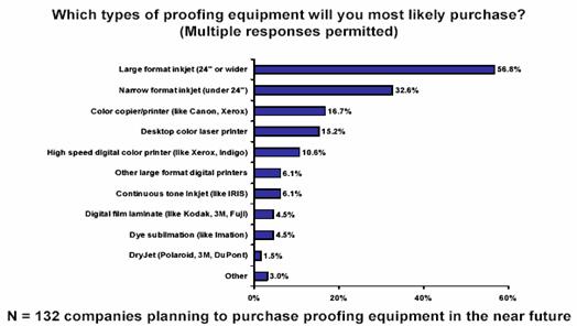 2004年1月市場研究公司InfoTrends發(fā)表的CAP ventures和“Digital Output Magazine” 聯(lián)合開展的公司用戶調(diào)查結(jié)果,回答近期內(nèi)公司準(zhǔn)備采購何種數(shù)碼打印設(shè)備時(shí),56.8%的公司準(zhǔn)備采購超過24英寸的寬幅噴墨打印機(jī),32.6%的公司準(zhǔn)備采購桌面噴墨打印機(jī),桌面彩色激光打印機(jī)的采購傾向用戶15.2%, 可見噴墨在該領(lǐng)域占主導(dǎo)地位,這種狀況在一定時(shí)間內(nèi)延續(xù)下去。