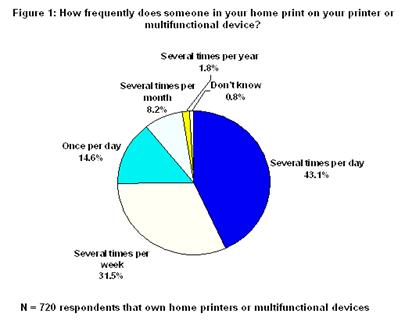 2003年8月CAP Ventures 通過對全美網(wǎng)上擁有家庭打印機(jī)的用戶進(jìn)行打印習(xí)慣調(diào)查,共有超過700名用戶參與調(diào)查并做有效回答,用戶使用打印機(jī)的頻率和打印張數(shù)下圖所示: