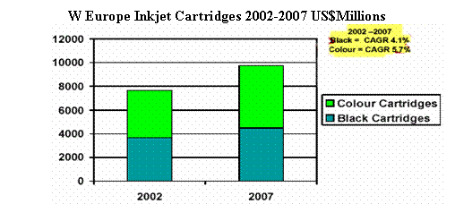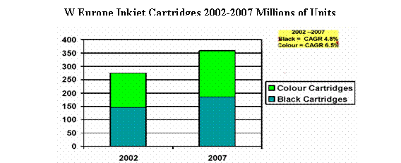 CAP Ventures 2003年對西歐市場的調(diào)查結(jié)果顯示,2002-2007年間,預(yù)期彩色噴墨墨盒的銷售數(shù)量年遞增率將達(dá)6.5%, 從2002年的1.26億個(gè)增加到2007年的1.72億個(gè)。而黑墨墨盒的年遞增率4.8%, 略低于彩墨增長率。銷售額的年遞增率則為黑墨 4.1%,彩墨5.7%。2002年彩墨墨盒的銷售額約40億美元,2007年可望達(dá)到52億美元。