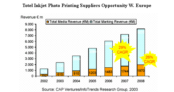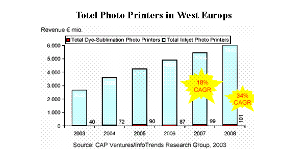 Infotrends /CAP Ventures 2004年2月的調(diào)查顯示, 2003年整個(gè)西歐照片噴墨打印機(jī)的市場銷售額為26.33億歐元,而熱升華打印機(jī)的銷售額僅0.40億歐元,2008年照片噴墨打印機(jī)的市場銷售額可望達(dá)到59.10億歐元,每年遞增率18%,熱升華1.01億歐元,由于基數(shù)小每年遞增率達(dá)34%。