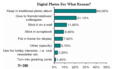 至于影像的輸出問題,兩種不同的打印方式同時(shí)占據(jù)市場并共同發(fā)展。一是用戶自己在家打印,從拍攝到輸出,全部自己搞掂。第二是通過專業(yè)連鎖店(在線或不在線)或零售打印店打印“照片”。對于輸出的影像,40%的用戶仍象傳統(tǒng)感光照片一樣將之保存在相冊中,21.1%的用戶將照片贈給親友或同事。